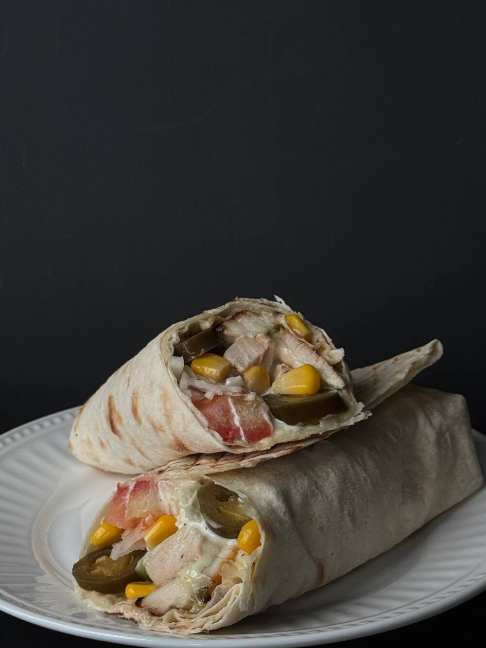 Лаваш, курица, капуста, перец халапеньо, кукуруза консервированная, томат, соус чесночный