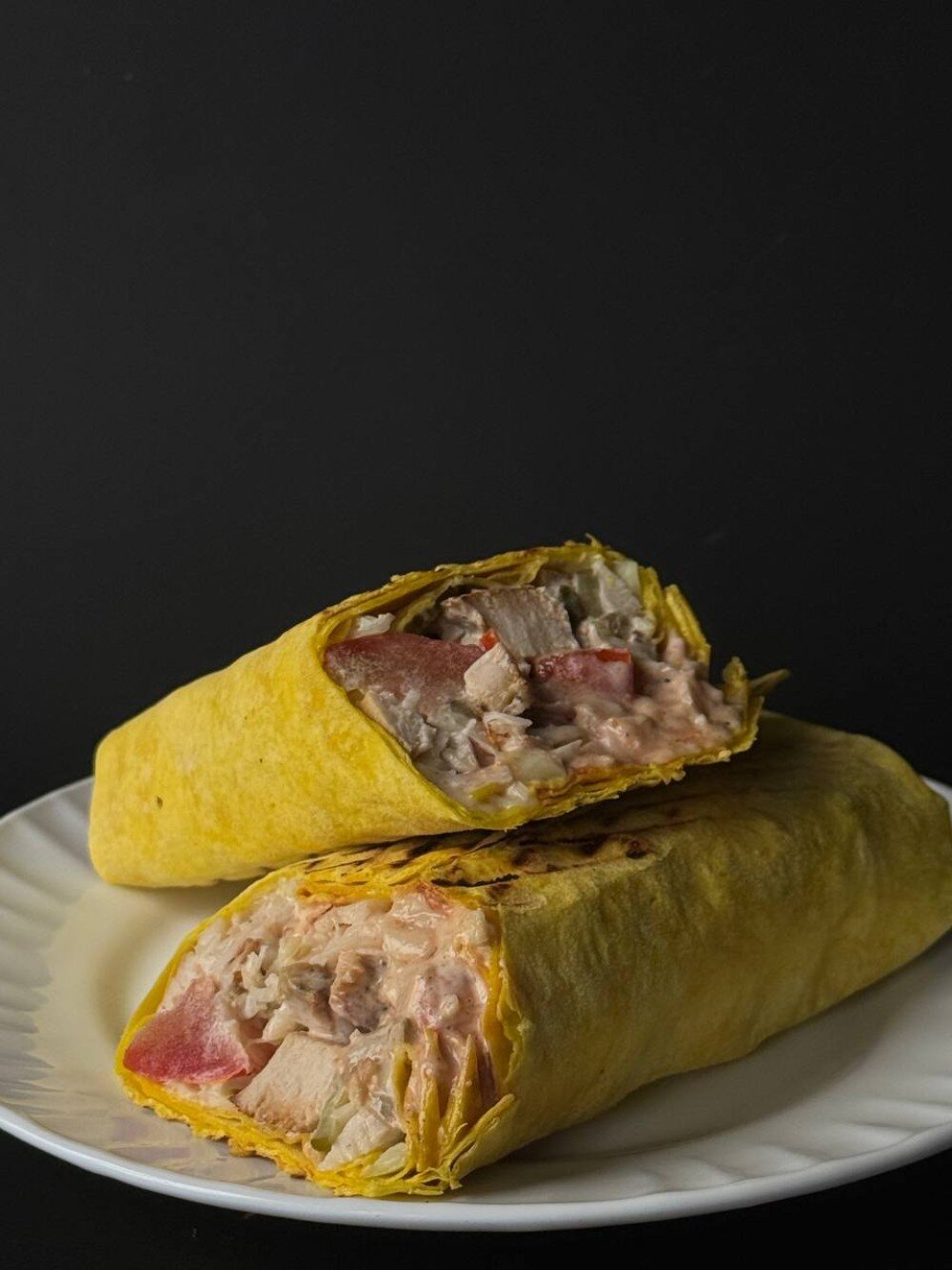Лаваш, курица с вертеля, соус сырный, сыр моцарелла, капуста, огурец соленый, томаты, соус чесночный, красный фирменный соус